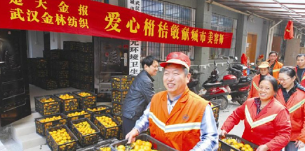 2011年10月27日正值武漢市第十五屆環(huán)衛(wèi)工人節(jié)由本報和武漢鑫林紡織一起送出的千余斤愛心橘分發(fā)到江城一線環(huán)衛(wèi)工手中,讓他們能在自己的節(jié)日里品嘗甜蜜,更能感受到來自社會各界的關愛與尊重。圖為江岸區(qū)一元街環(huán)衛(wèi)所環(huán)衛(wèi)工高興地領取愛心橘。 另悉,在昨日“環(huán)衛(wèi)工人節(jié)”表彰大會上,武漢市有60人獲“城市美容師”稱號,100人獲得“先進市容環(huán)衛(wèi)工作者”稱號。武漢市城管局負責人在會上提出,要將環(huán)衛(wèi)工作打造成武漢的城市品牌。